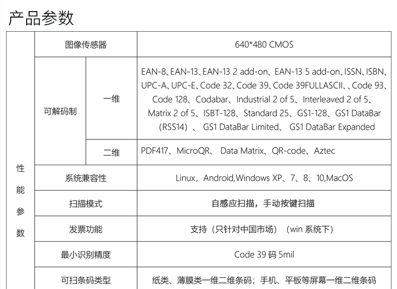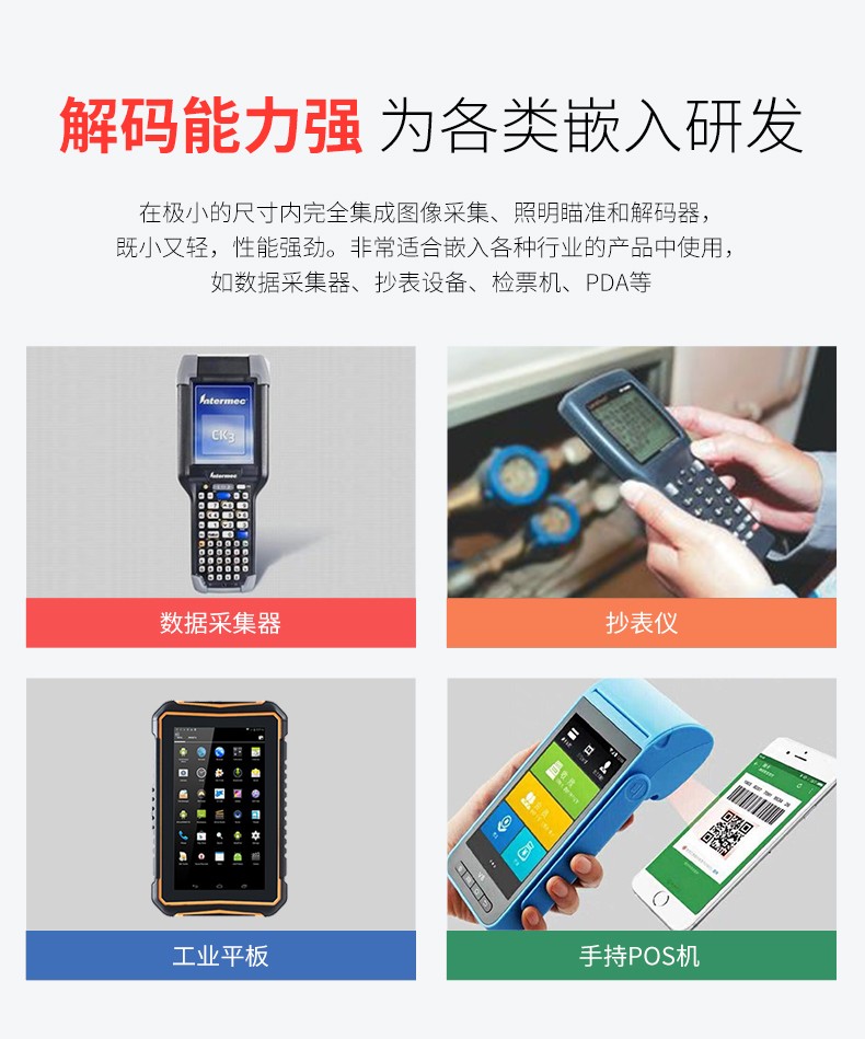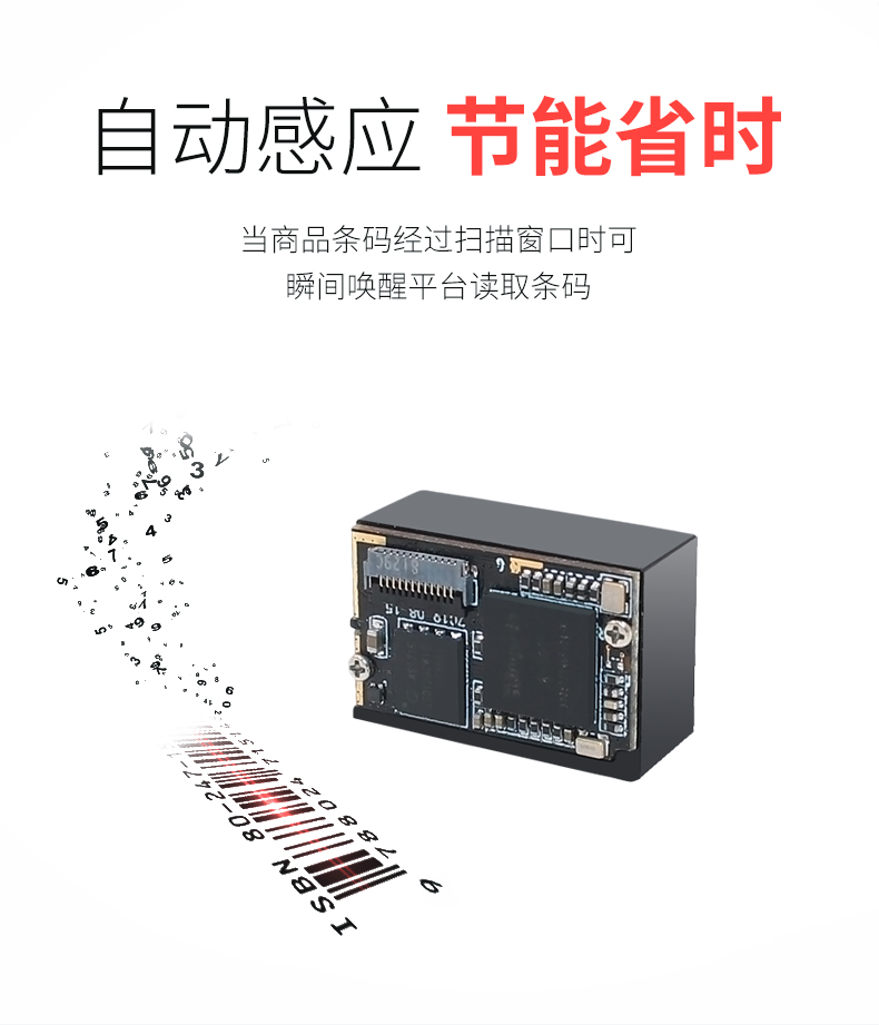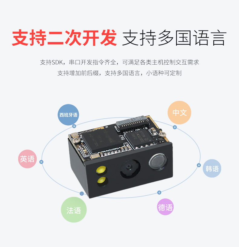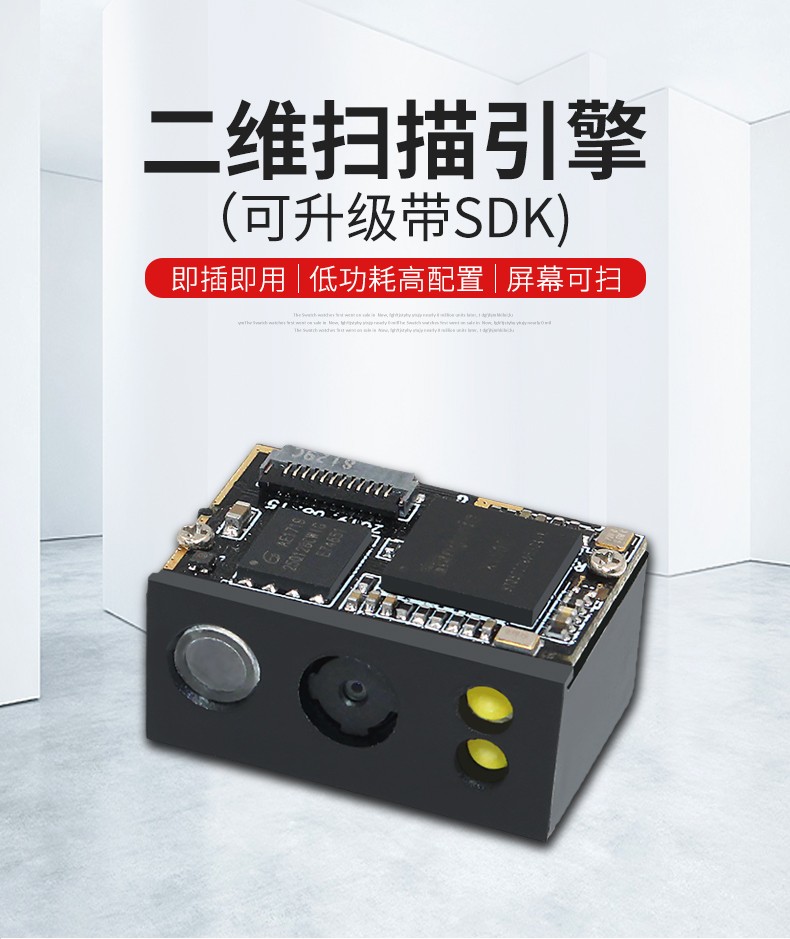 二维扫描引擎,可升级带SDK,即插即用,低功耗高配置、屏幕可扫,CMOS影像;解码能力强,为各类嵌入研发,在极小的尺寸内完全集成图像采集、照明瞄准和解码器,既小右轻,性能强劲。非常适合嵌入各种行业的产品中使用,如数据采集、抄表设备、检票机PDA等;体积小巧,便于嵌入,精巧的设计可以方便嵌入,二维码门禁、闸机、零售收银等设备中;快速扫描,纸质和屏幕条码,优越的性能,能快速识别纸类、薄膜类一维、二维条码,高反光屏幕码、亮度低屏幕码;低功耗高配置,拒绝卡顿;自动感应,节能省时,当商品条码经过扫描窗口时,可瞬间唤醒平台读取条码;支持二次开发,支持多国语言,支持SDK,串口开发指令齐全,可满足各类主机控制交互需求,支持增加前后缀,支持多国语言,小语种可定制;可在线升级迭代、不能读取条码研发支持,通过Flash Utility软件在线升级;兼容各大系统。