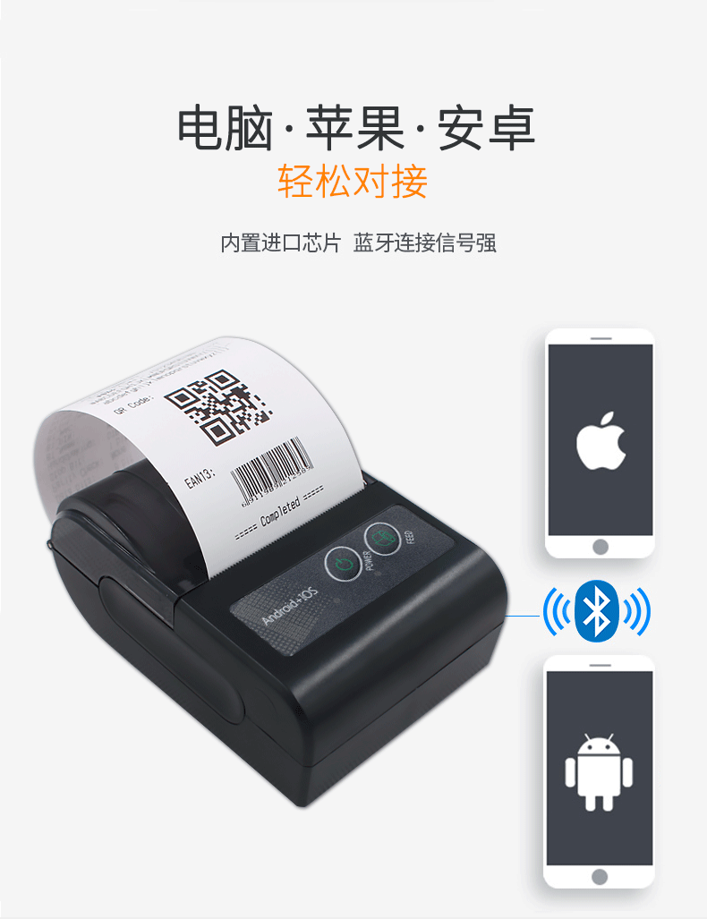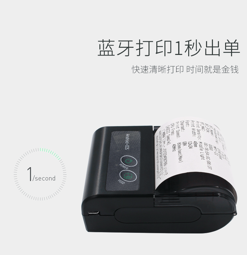 热敏打印满足各行业需求,支持各种外卖平台;免碳带,方便,便捷,小巧轻便,一手掌握,装包包口袋都OK;电脑,苹果,安卓轻松对接,内置进口芯片,蓝牙连接信号强;蓝牙打印1秒出单,快速清晰打印,时间就是金钱;省心易用,免墨水,墨带,碳带,省心更省钱;长久待机电池耐用,优质电池,一次充电使用48小时以上。