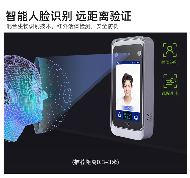 活体检测人脸识别距离 0.3 米~1.5 米;