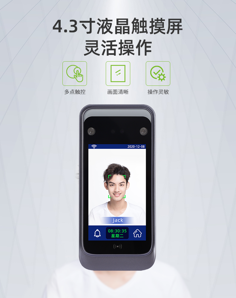 采用基于视频流的动态人脸检测、跟踪,1:N 识别算法。快至 0.3 秒准确识别人脸;