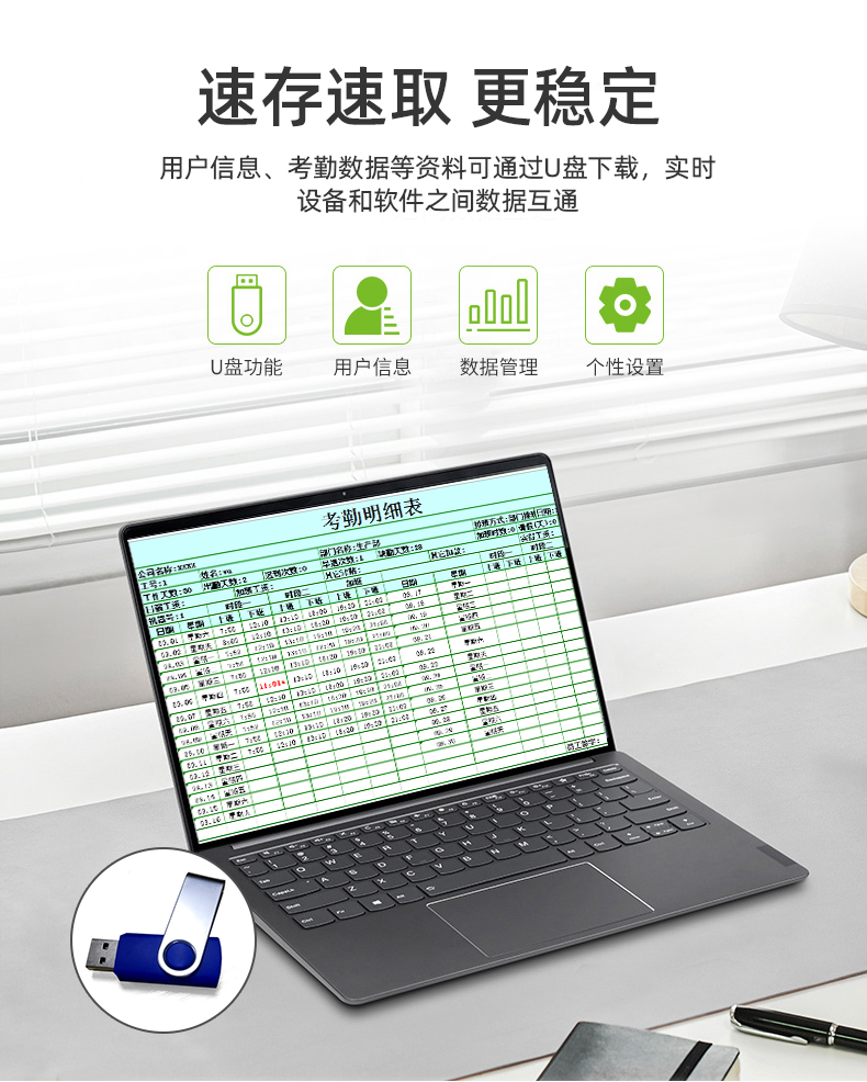 双模报表输出,支持 U 盘导出考勤报表,支持后台软件统计考勤报表;