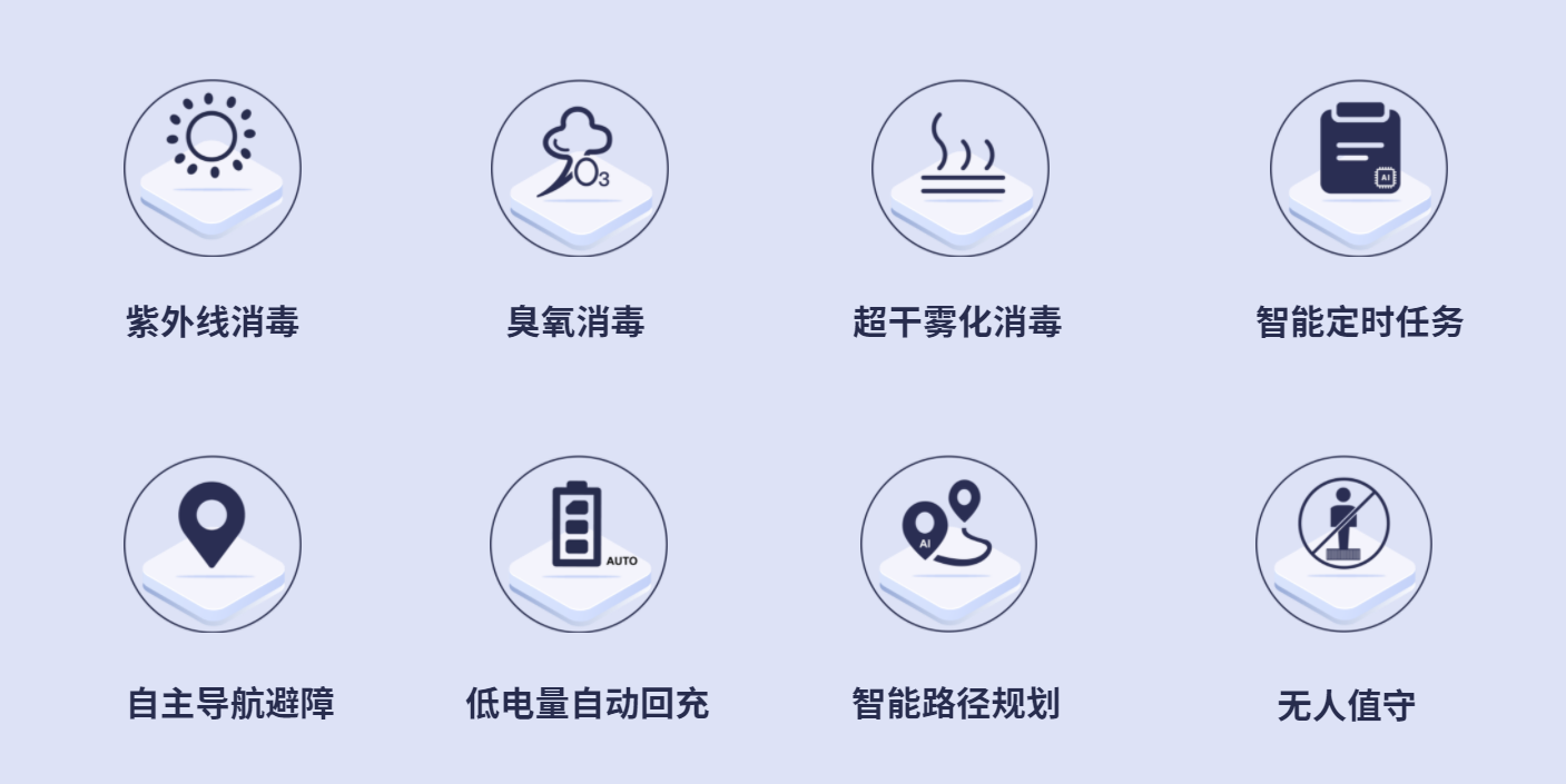 艾森消毒机器人搭载多种智能传感器,可选择灌装不同类型消毒液,并高速均匀喷洒到指定消毒区域,实现消毒。还可以通过紫外线实现消毒