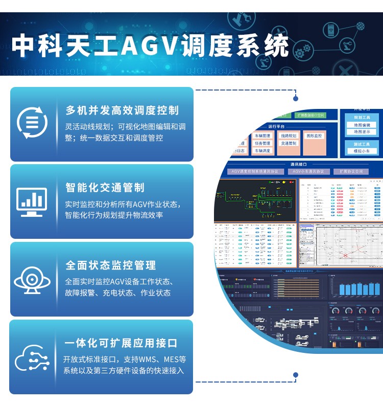 背负举升型AGV,采用高性能举升机构,可实现车货同转、车转货不转功能。采用自然导航+二维码复合导航的方式,面对工厂复杂的环境,一方面采用自然导航进行环境信息定位,另一方面在环境识别差的地方,可采用5m内反光板定位或者粘贴二维码进行二维码位姿信息反馈定位,能更精确地反馈AGV的定位信息,实时解决AGV在工厂运行的问题。