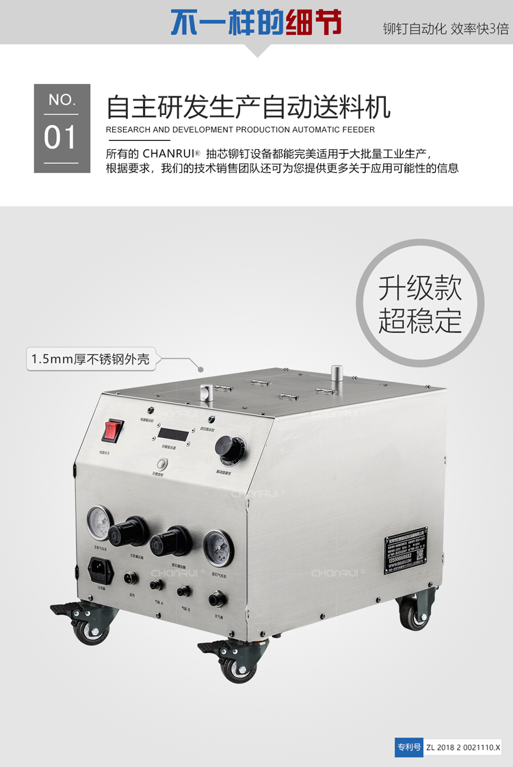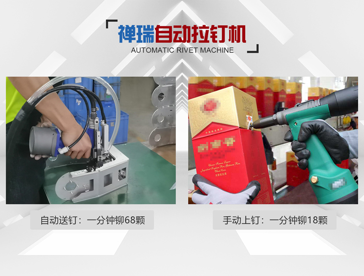 禅瑞自动抽芯铆钉机采用德国高精度加工技术。铆钉枪缸体内壁研磨精度达0.4以下,铆钉枪气缸采用锻造方式,强度增加1.6倍,6年内出货故障率控制在2%以下,配件采用德国进口碳钢3爪,使用寿命高达600万次。高效稳定,操作简单,有计数功能。