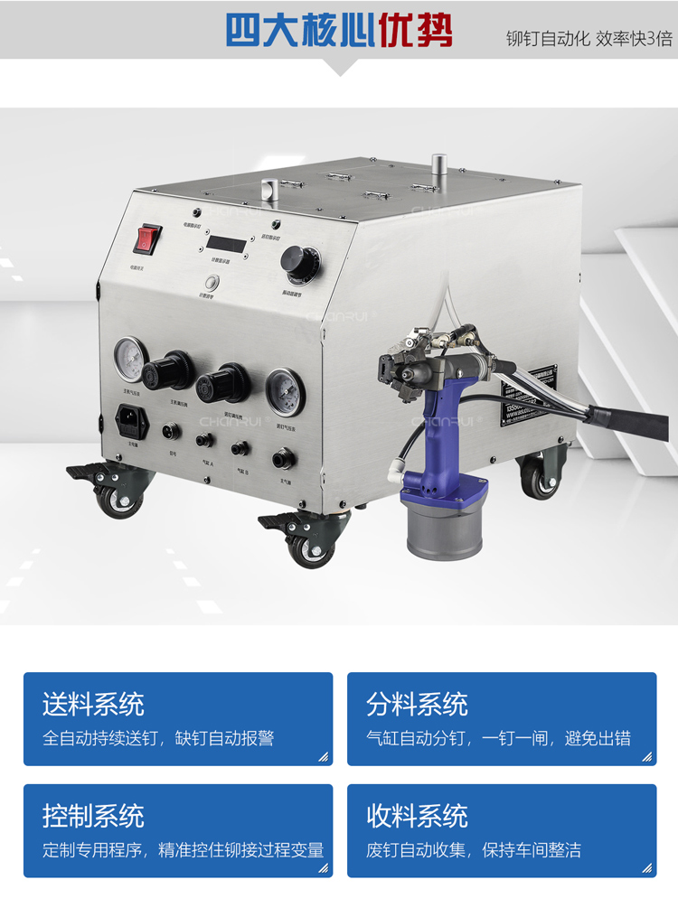 禅瑞自动抽芯铆钉机采用德国高精度加工技术。铆钉枪缸体内壁研磨精度达0.4以下,铆钉枪气缸采用锻造方式,强度增加1.6倍,6年内出货故障率控制在2%以下,配件采用德国进口碳钢3爪,使用寿命高达600万次。高效稳定,操作简单,有计数功能。