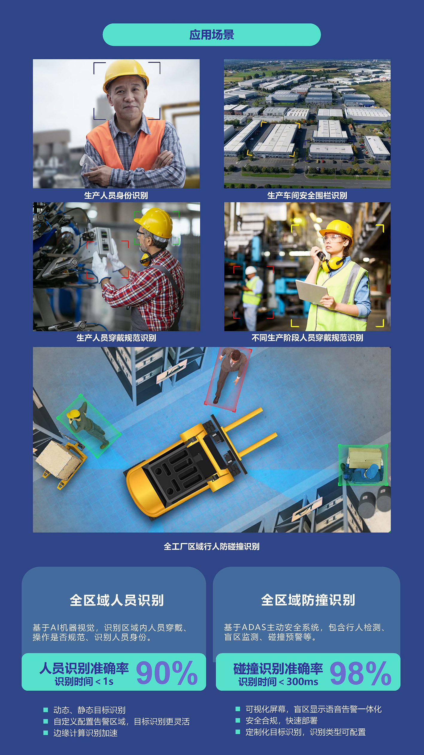 方案基于人工智能模式识别算法,对工厂全区域安全情况进行实时监测,实现防撞识别、人员识别两大核心功能。对工人的身份、着装以及操作情况、区域内碰撞风险进行全方位、全时段的智能监测及自动预警,保证工厂安全。