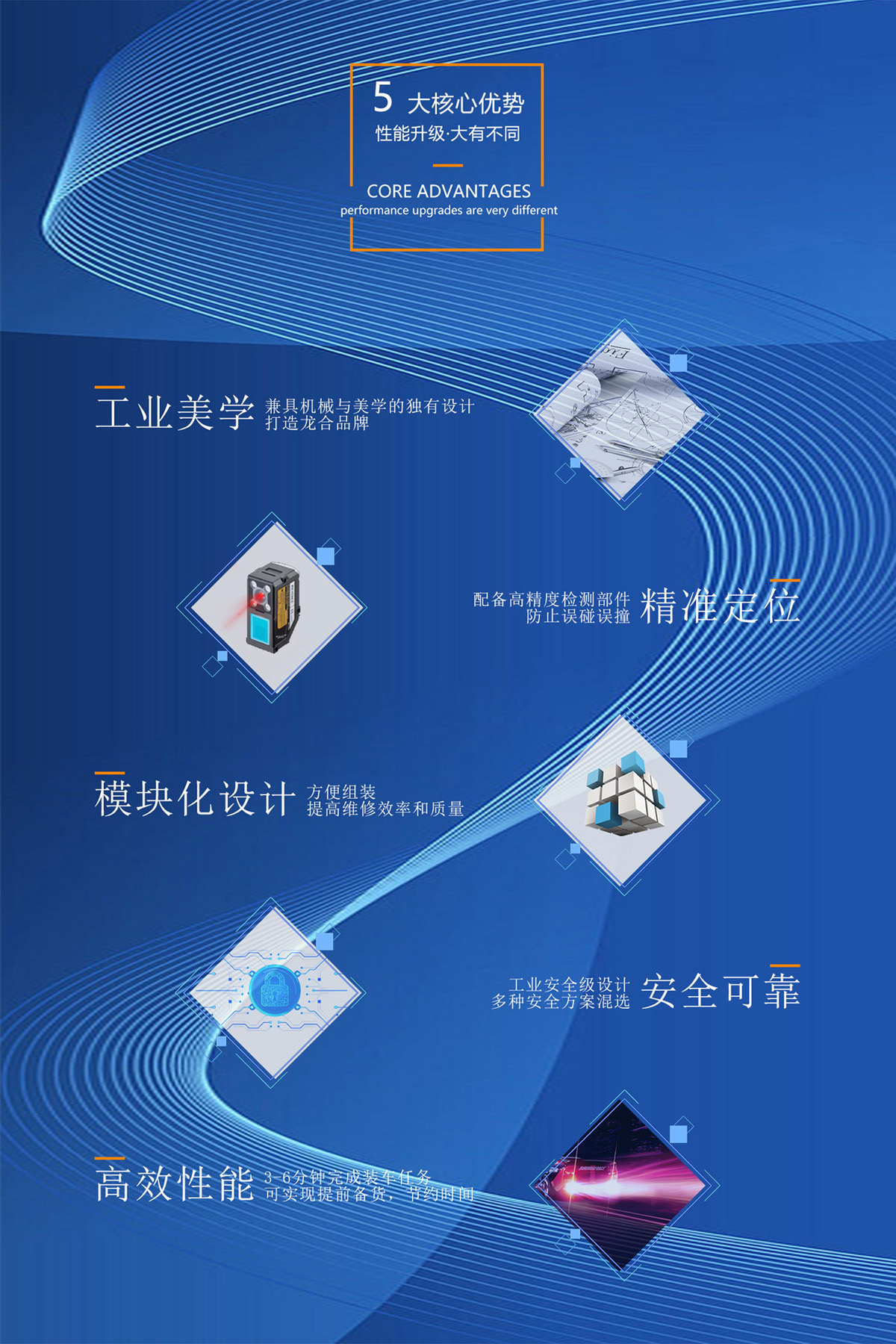 极速智能无人装卸系统属于龙合智能无人装卸系统三大系列产品之一。整车货物预先出库在装载平台上紧密排列备料,车辆停靠到位后一次性进入车厢装载,3-6分钟完成一车货物的装载。车厢内不需要安装其它装卸车设备,不需要对车辆进行改装。龙合极速智能无人装卸系统可适用于20尺/40尺集装箱。