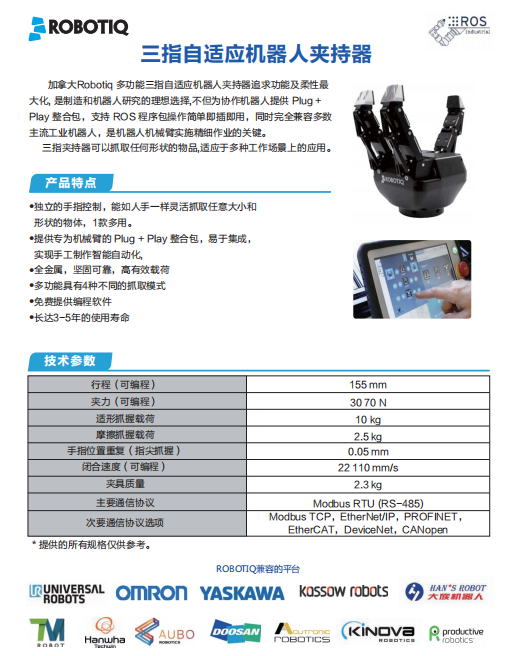 三指夹爪是的多功能性和灵活性的选择。它可以拾取任何形状的任何物体。三指夹爪与所有工业机器人兼容。使用Robotiq的三指夹爪,您将专注于您的研究目标,而不是努力整合您的末端执行器。