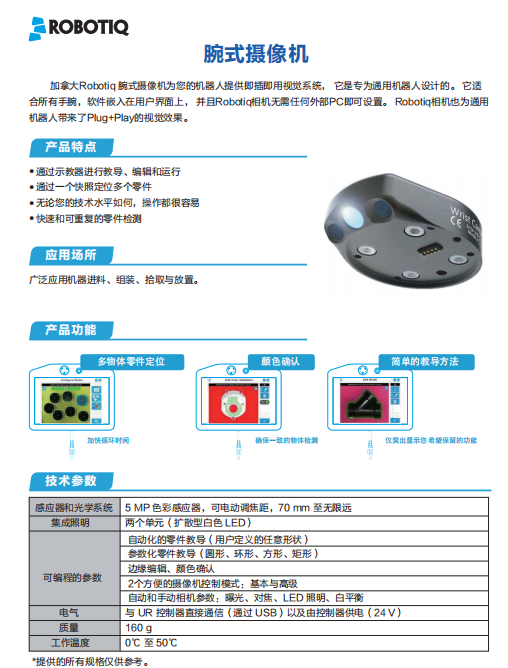 Robotiq腕部相机旨在与Universal Robots一起执行工业应用。教新零件并快速检测,以确保可重复挑拣。 只需通过30分钟不到的设置时间,且无需任何编码。