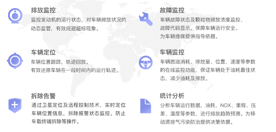 监控发动机的运行状况和尾气后处理模块工作状态。随时掌握车辆运行的各项参数,实现对车辆排放状况的长期动态监管,便于及时对车辆进行维修和保养,有效规避超标现象。从而使重型柴油车的污染排放得到有效改善。