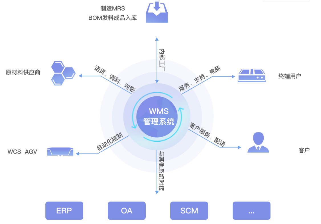 WMS通过入库业务、出库业务、仓库调拨、库存调拨和虚仓管理等功能,对批次管理、物料对应、库存盘点、质检管理、虚仓管理和即时库存管理等功能综合运用的管理系统,有效控制并跟踪仓库业务的物流和成本管理全过程。