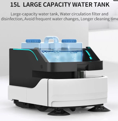 这是一款多功能大型商用清洁机器人。是全球首款集扫地、吸尘、拖地、消毒于一体的清洁机器人。解放双手,提高地板清洁效率,为企业创造良好的健康环境。