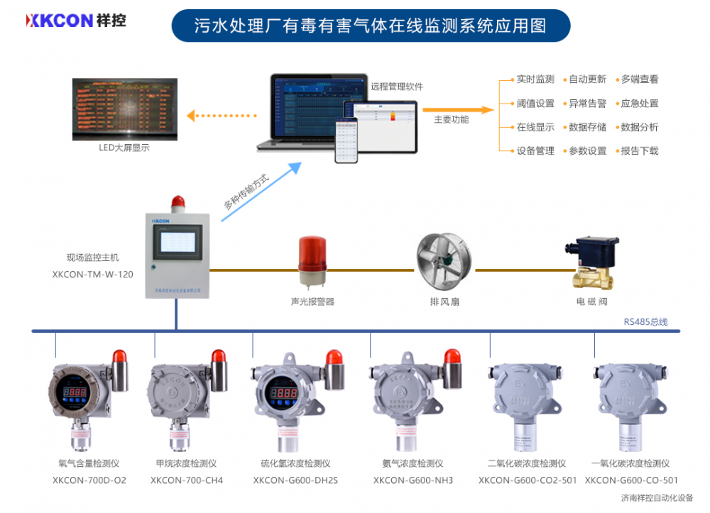 济南祥控自动化设备有限公司设计的XKCON祥控污水处理厂有毒有害气体在线监测系统采用传感器、数据通信、人工智能等多项***技术,能够对污水处理厂恶臭气体中的H?S、NH?、CH?、O?、CO、CO?等有毒有害气体进行实时、自动、连续监测,并与排风等环境调控系统相连,可发现并及时处置存在的安全隐患,助力安全生产。