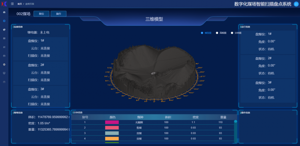 通过使用三维建模技术和计算机图形处理技术,对空间位置信息数据在计算机平台进行三维坐标转换,生成煤堆轮廓图形,还原被测料场的真实形状,科学计算出料场体积。