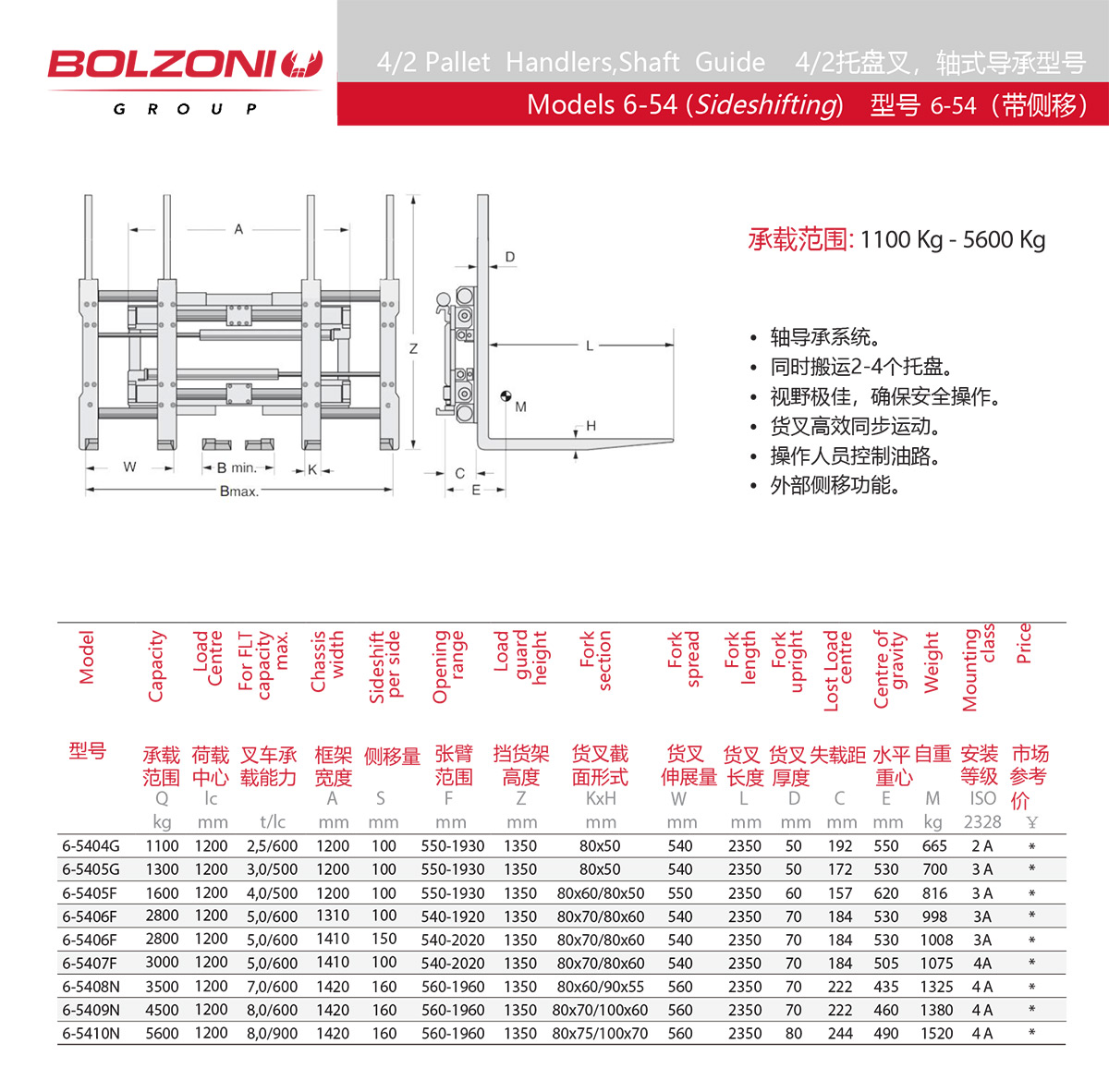 博索尼:4-2托盘叉,轴导承型号6-54带侧移