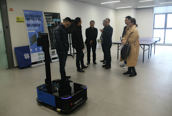 在参观过程中,李所长对我司的无标记搬运机器人颇感兴趣,蓝芯科技视觉导航机器人采用自主研发的导航系统,基于环境自然特征建图、导航和规划路径,无需铺设轨道和地标,即使在动态环境中也可以实现高精度定位。产品部署无需对作业环境进行大幅改造即可投入生产,部署时间短、成本低 。李所长一行被我司的无标记导航机器人的技术领先性和使用灵活性所深深吸引。对我司研发实力、领先产品及相关行业解决方案为一体的完整产业价值链颇为赞赏。最后,双方就彼此在机器人领域的优势及合作的可能性进行了深入探讨。