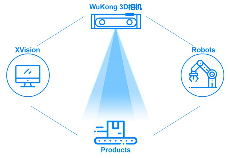 XPick 3D--智能3D抓取系统由杭州蓝芯科技自主研发,主要由WuKong 3D相机和XVision(智能3D检测定位算法)组成,它融合了3D机器视觉和深度学习。这样的融合赋予了机器人真实环境的“感知能力”和“手眼协同能力”,使他们能够通过思考来执行任务。
