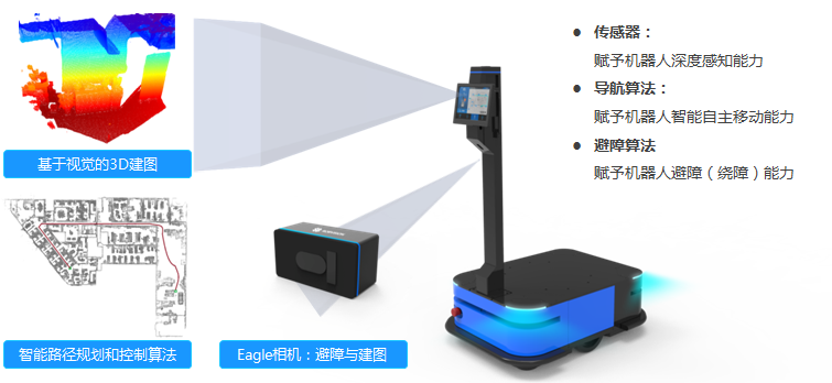 ◆ 该款机器人采用2D激光+3D视觉传感器实现安全防护,能够实现空间立体避障和自主绕障,大大提高了行驶安全性。
