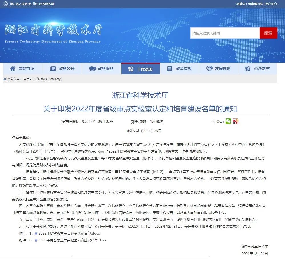 近日,浙江省科技厅发布《关于印发2022年度省重点实验室认定和培育建设名单的通知》(浙科发基〔2021〕79号),申昊科技申报的“浙江省智能运维机器人重点实验室” 获得批准认定。