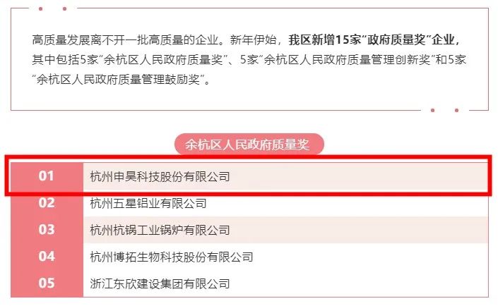 余杭区人民政府质量奖是余杭区人民政府对区内对实施卓越绩效管理并在产品生产、工程建设、服务提供、环境保护等方面取得显著经济效益和社会效益的组织(包括企业或其他组织)授予的全区最高质量奖励。