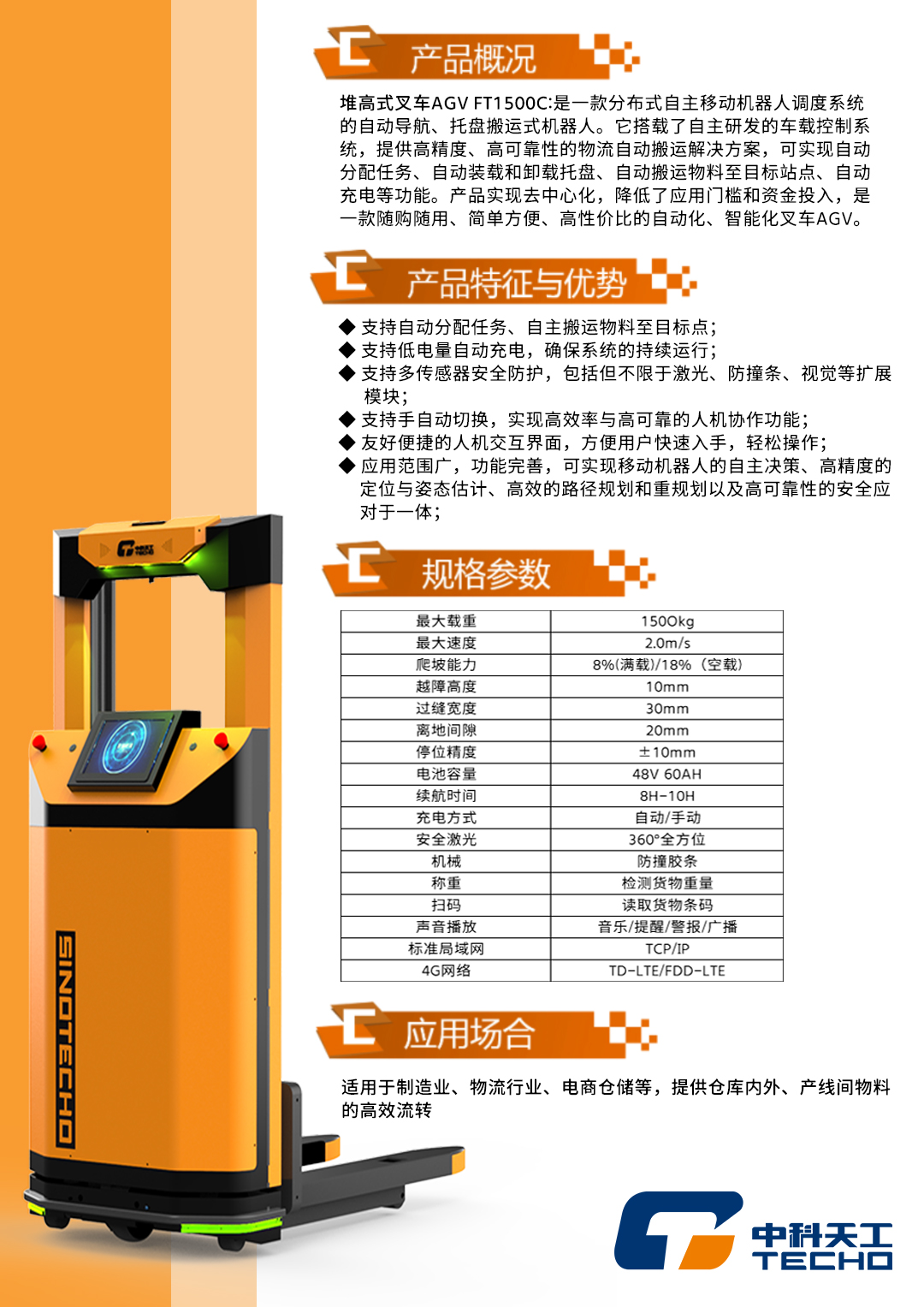 中科天工正是在这样的契机下,快速响应市场,布局市场,除了和各大又车主机厂进行了合作研发外,也陆续推出了平面搬运式AGV,堆高式叉车AGV,平衡重式叉车AGV,牵引式叉车AGV等涵盖常规叉车产品的完整叉车AGV产品线。