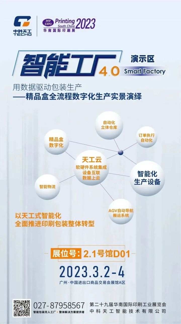 2023华南国际印刷展、中国国际标签展(简称2023华南国际印刷标签展)将于2023年3月2-4日在广州琶洲举办。 中科天工重磅打造“智能工厂4.0”演示区,现场演绎“用数据驱动包装生产一一精品盒全流程数字化生产实景演绎”,全面展示全产业链技术设备,展现印刷包装领域最新创新成果。届时,来自全国各地的业界人士将会齐聚一堂,共同探讨数字印刷领域的前沿技术与创新应用。 展会期间,中科天工将打造一站式专业解决方案、专业技术交流平台。为国内外印刷、包装企业提供最新的技术、设备和服务,助力我国智能工厂向上发展!