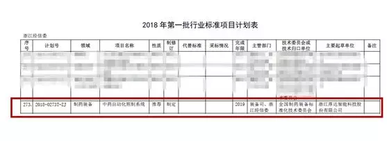 2018年1月26日,工业和信息化部科技司公布了2018年第一批行业标准制修订和外文版项目计划,其中包含制药装备领域的《中药自动化煎制系统》行业标准,该项标准将由我司作为第一起草单位进行制定。